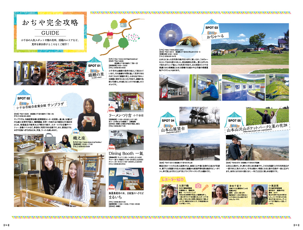 「おぢや企業ガイドブック 100ページ」は、小千谷市内の企業への就職を希望する学生を促進するために、地元の高校生対象版と、大学生・専門学生などの2種類を作成いたしました。参加企業は、約50社。各企業の紹介と、各ご担当者から小千谷市内の名所を紹介していただき、観光案内的な要素も含む、読みやすい企業ガイドブックとなりました。
